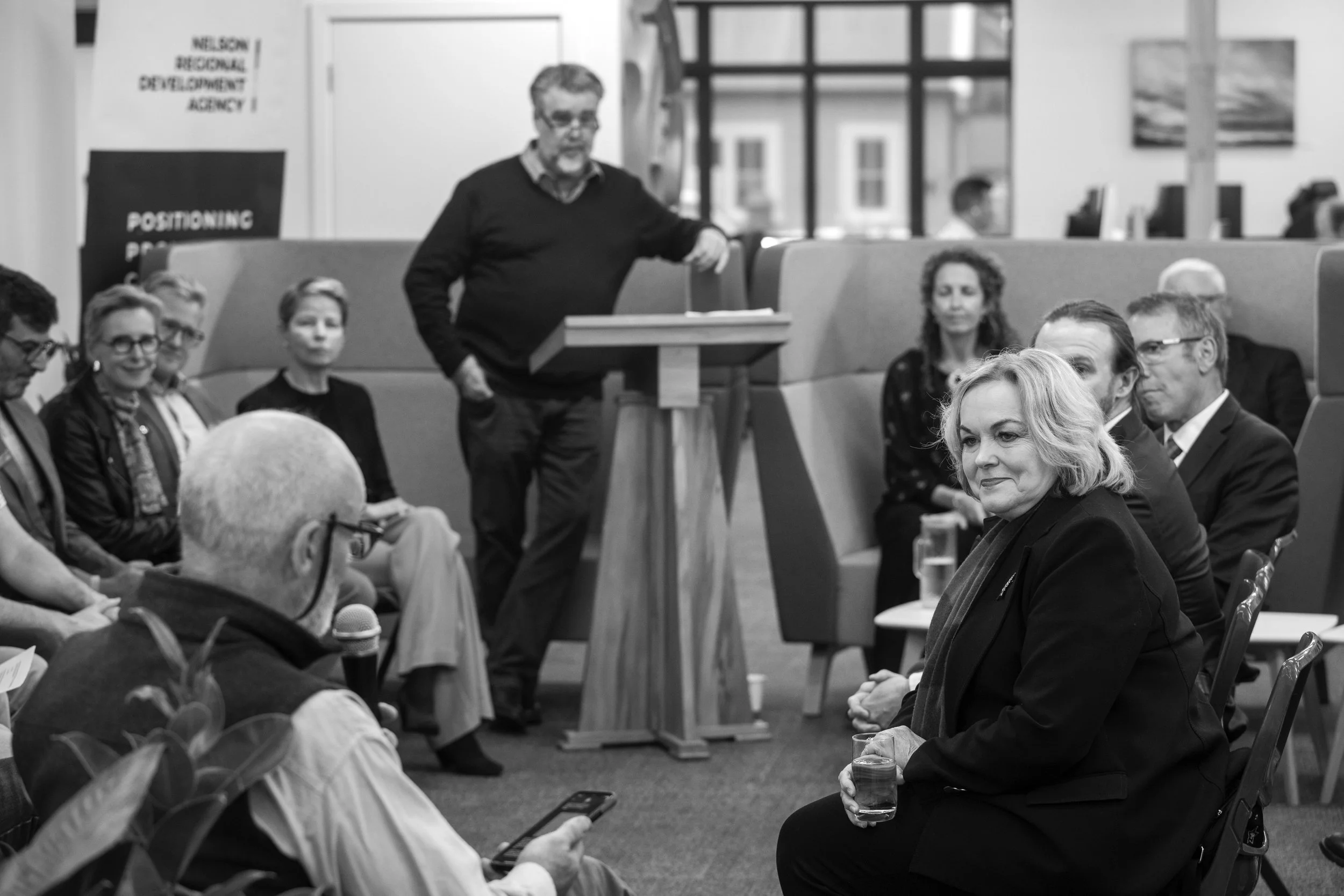 Science, Innovation and Technology Minister Hon Judith Collins (right) hears from Nelsonians involved with the Nelson AI Sandbox about their utilisation of AI, including Emma Thompson from Publik. Photo: Tim Cuff.
